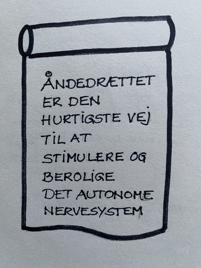 Jeg forklarer, at åndedrættet både er en bro til hurtig vejrtrækning og pludselig aktivitet, når det er påkrævet, og en bro til ro og nærvær.