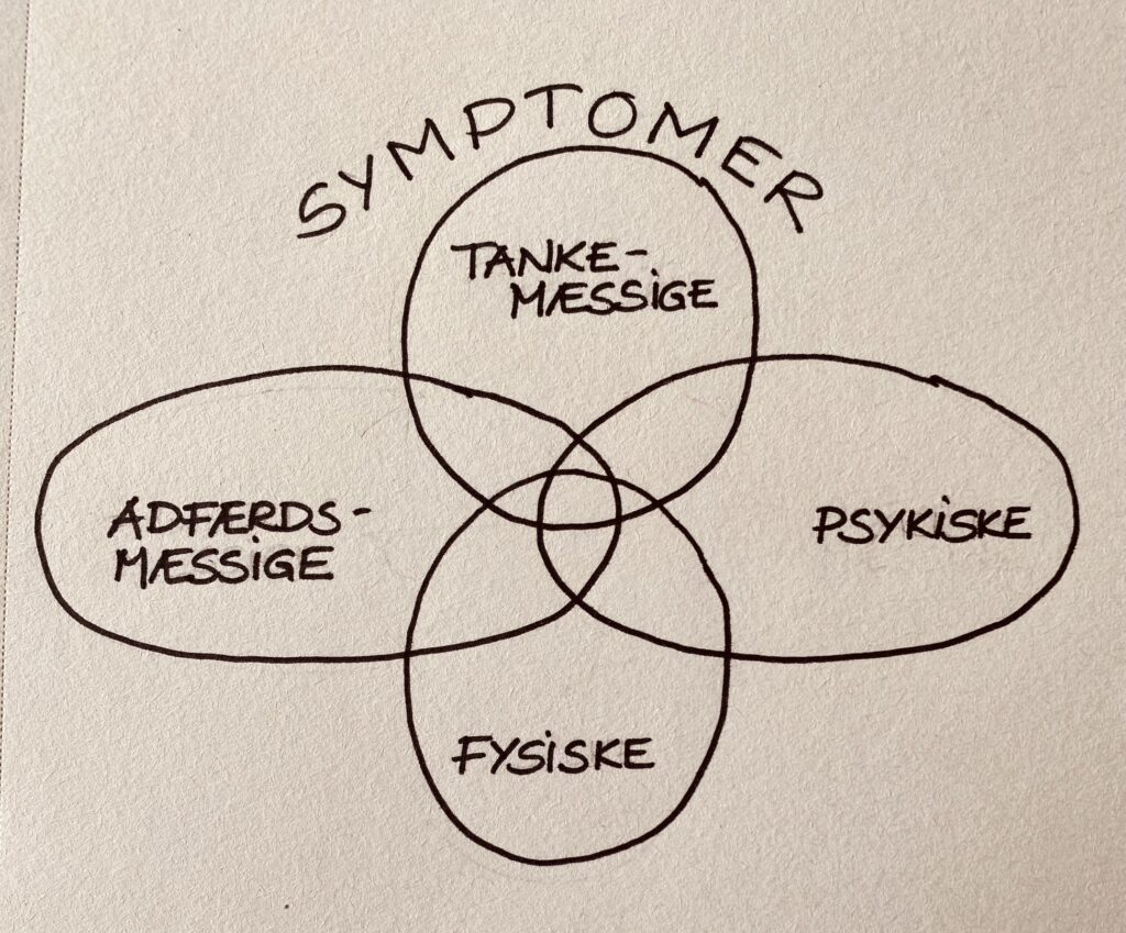 Angstsymptomer kan være både fysiske, psykiske (følelsesmæssige), tankemæssige eller adfærdsmæssige og ofte er det en sammenblanding af alle 4 kategorier.